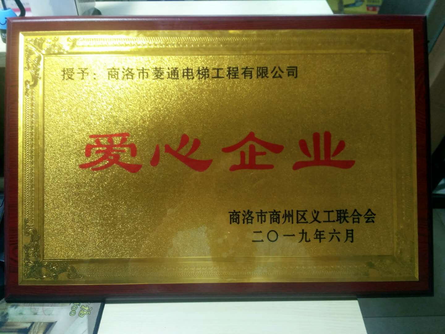 商洛市義工聯(lián)合會(huì)2019年6月,授予:商洛市菱通電梯工程有限公司愛心企業(yè)獎(jiǎng)