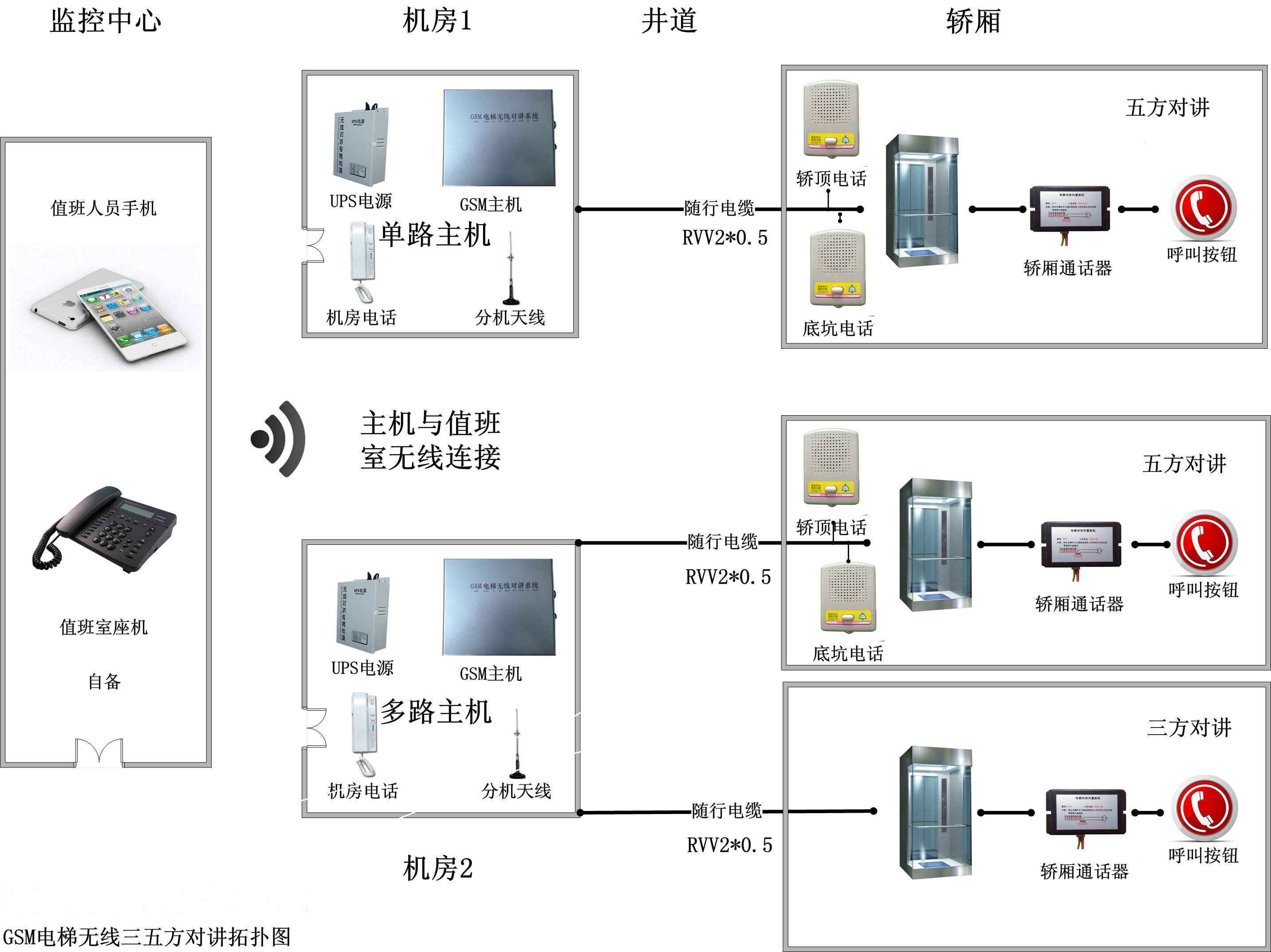 安裝方法:將電梯無線對講主機安裝在電梯機房。首先使用劃線器標(biāo)出安裝位置,用電鉆鉆孔,將螺栓把主機固定好。最好安裝在離門窗近的地方方便無線信號的接收和發(fā)射,把12V-UPS電源插在電源接口上,打開電源,看電源燈是否已變亮,看主機側(cè)面電源燈是否變亮,變亮表示主機已處于正常工作狀態(tài),把機房電話接入電話接口處,最后再插入控制線到通話器接口上,把控制線上的兩條(黃綠)線接入準(zhǔn)備好的兩條隨行電纜上,這時機房設(shè)備已全部安裝完備(注:每臺主機可接三臺電梯)。